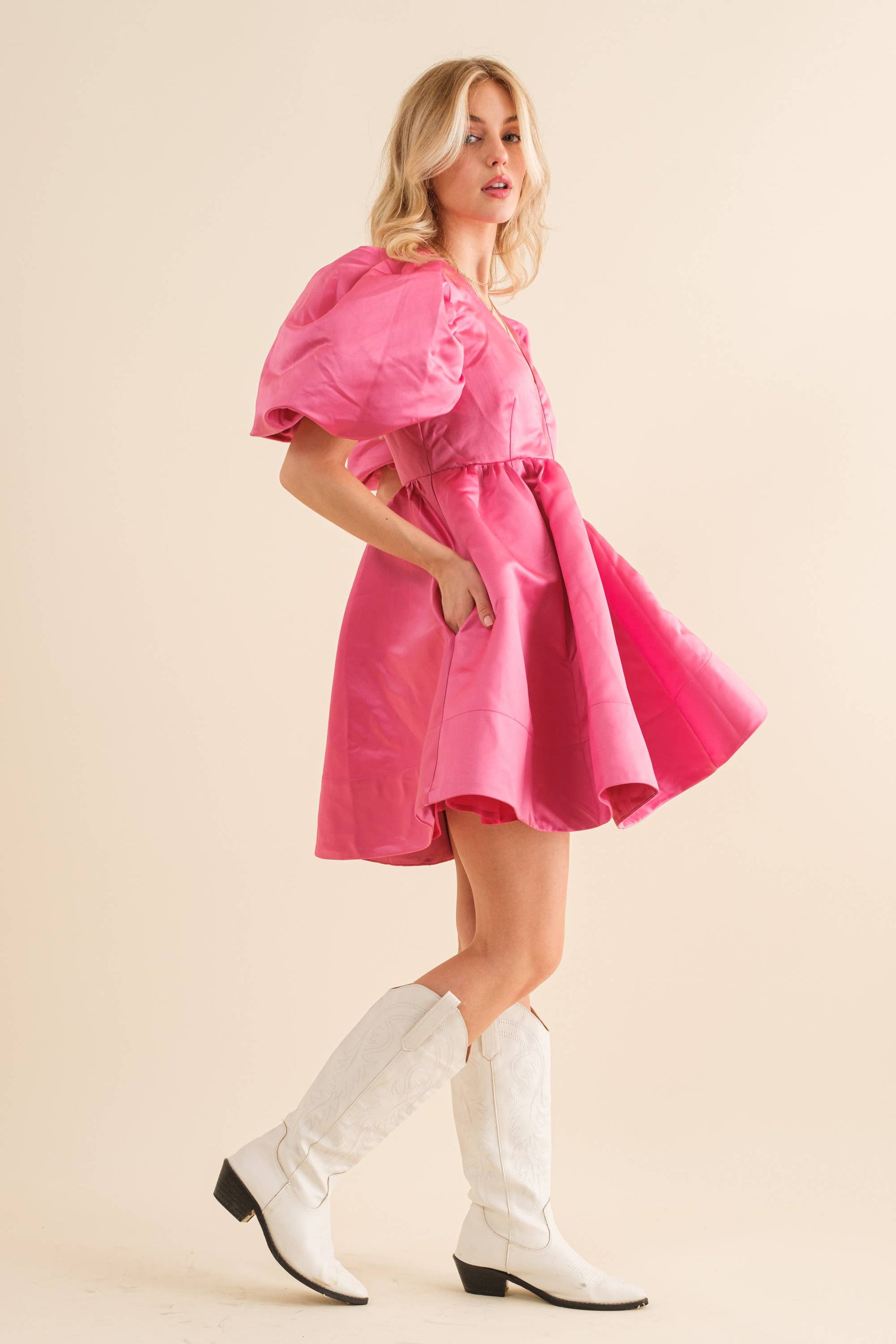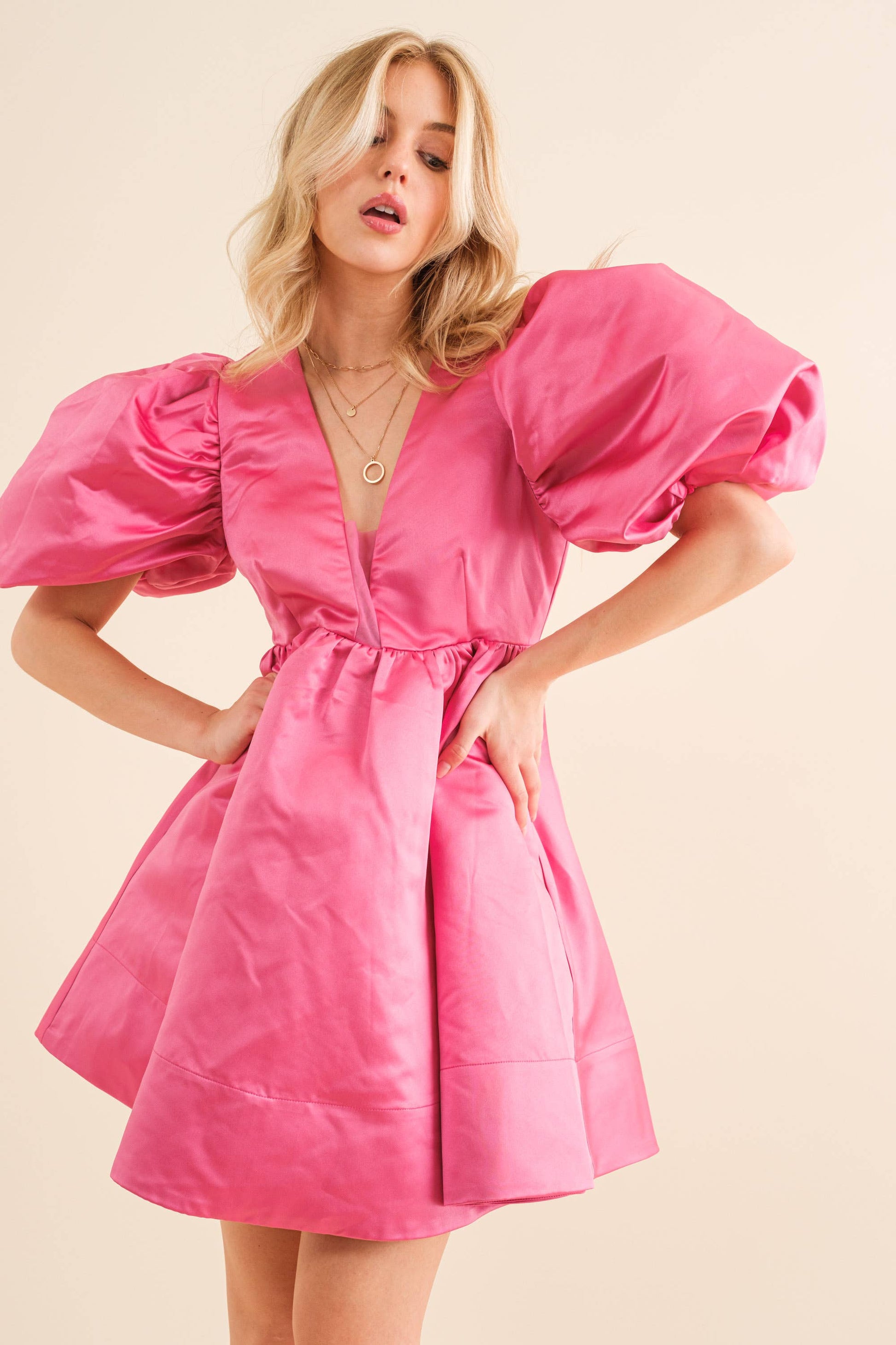 Solid Woven Balloon Puff SLV Empire V Neck Puff Mini Dress